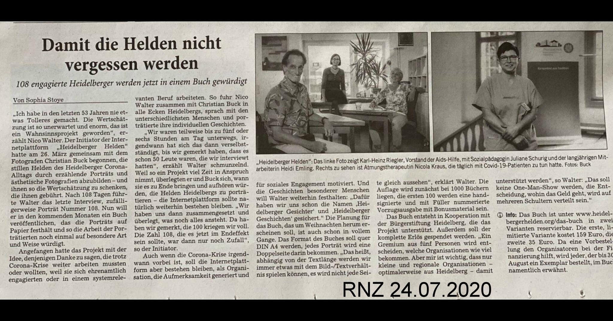 Nico Walter und Christian Buck portraitieren auf ihrer Seite www.heidelbergerhelden.org Heidelberger*innen, die während der Corona-Pandemie die Gesellschaft am Laufen halten; also systemrelevant sind. Dabei haben sie insgesamt 108 Portraits und die unterschiedlichsten Geschichten und Erfahrungen aus dieser Ausnahmezeit zusammengetragen. Dabei ist ein wunderbares, berührendes und hochwertiges Buch entstanden.